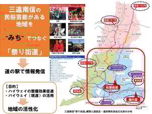 三遠南信地域全体が民俗芸能の宝庫であり、国道151号、152号、257号をはじめ、既存道路を活用して祭りの地域を巡る仕組みをつくるプロジェクトを行いました。