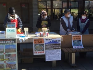 シーニック・マルシェでは、道の駅「朝霧高原」と連携して、道の駅で取り扱っている農産物や名物のとん汁などの販売を行いながら、道路利用者に住民による美化活動やごみのポイ捨ての禁止などを啓発しています。