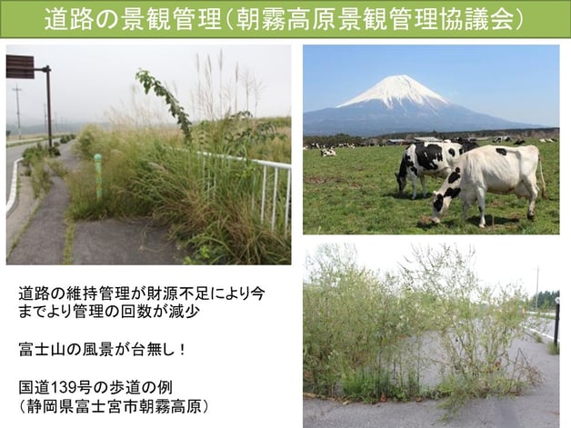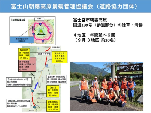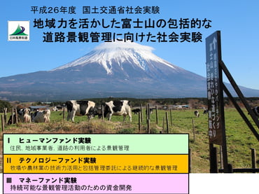 富士山「朝霧高原」の国道139号の道路景観を管理するため、地域住民が主体となって、地元企業、NPOが行政と連携して社会実験を行いました。